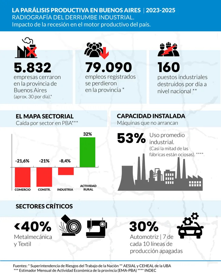 Con más de 5.800 empresas cerradas en territorio bonaerense y una utilización de la capacidad instalada en niveles pandémicos, la provincia de Buenos Aires se consolida como el epicentro del deterioro industrial argentino.