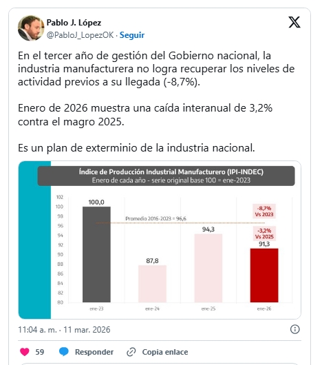 Sostuvo también que la mitad de las empresas industriales enfrenta dificultades para pagar impuestos, salarios, proveedores y servicios, lo que comienza a tensionar las cadenas de pago. "A diferencia de lo que dice el gobierno: no es culpa de empresarios prebendarios, industriales ineficientes o trabajadores vagos, es Milei y su política económica. Acá están las consecuencias productivas", cerró.