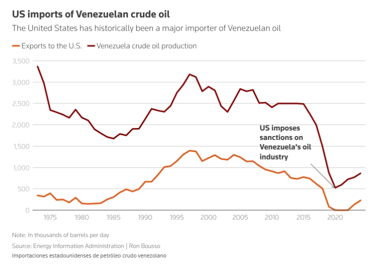 Las exportaciones de crudo venezolano a EE. UU. alcanzaron un máximo de 1,4 millones de bpd en 1997, cuando representaron el 44 % de la producción venezolana, según la Administración de Información Energética. El flujo disminuyó gradualmente hasta 506.000 bpd en 2018, a medida que aumentaba la oferta de crudos pesados competidores de EE. UU., México y Canadá.