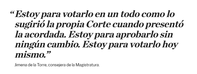 Cuando se retiró Rosatti, Vázquez habilitó el micrófono a la abogada Jimena de la Torre, que llegó al consejo por impulso de Mauricio Macri y sufre ahora el asedio del sector que responde a Daniel "Tano" Angelici. De la Torre, que se conectó por zoom desde el aeropuerto donde esperaba para abordar un vuelo, quiso apurar el debate: "Estoy para votarlo en un todo como lo sugirió la propia Corte cuando presentó la acordada. Estoy para aprobarlo sin ningún cambio. Estoy para votarlo hoy mismo. Perdonen que tengo que adelantar mi voto pero tengo que partir", anunció para disgusto de varios de sus colegas.