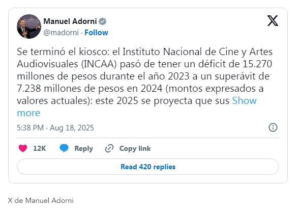 "Se terminó el kiosco: el INCAA pasó de tener un déficit de 15.270 millones de pesos durante el año 2023 a un superávit de 7.238 millones de pesos en 2024 (montos expresados a valores actuales). Este 2025 se proyecta que sus cuentas también serán positivas. Saludos a todos. Fin", escribió en X.