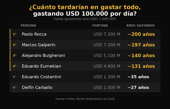 El dato ya es obsceno, pero empeora al cruzarlo con los salarios. "Para ponerlo en perspectiva argentina -siguió Girard- Salario mínimo 2026: US$ 233/mes. Un trabajador con salario mínimo tardaría 36 años en juntar USD100.000 de ingresos, sin consumir nada". O sea, con el salario mínimo se tardaría 36 años en juntar lo que podrían gastar estos ultramillonarios por día durante 200 años sin dejar de ser millonarios. El cálculo se puede hacer con el salario promedio, que hoy ronda los 1.200 dólares. Un trabajador con ese sueldo tardaría 7 años en juntar 100.000 dólares, eso si no gasta nada.Esta semana también salió el monto de la canasta básica de pobreza, que roza los 1.400.000 pesos sin contar alquiler, con lo que habría que colocarlo en unos 2.200.000 pesos mínimo. Son unos 1.500 dólares. Entre los 2 adultos que juntan eso para no ser pobres demorarían 5 años y medio en juntar los 100.000 dólares que Rocca o Galperín podrían dilapidar por día por 200 años. La brecha es abismal.
