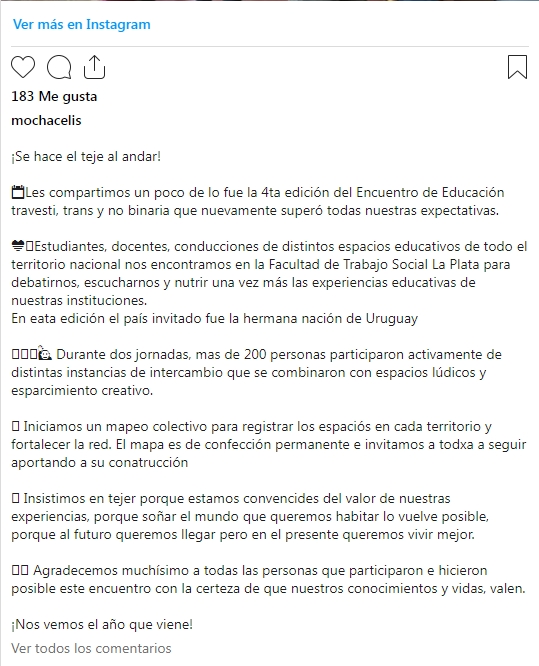 A finales de septiembre pasado impulsaron, junto a otras entidades, el 4to. Encuentro de Educación Travesti Trans y No Binaria en la localidad bonaerense de La Plata. Trabajadores de la educación y estudiantes se reunieron en dos jornadas para debatir sobre la realidad educativa y el acceso a la educación en la región. Participaron funcionarios, como la ministra de Mujeres y Diversidad de la provincia, Estela Díaz; y autoridades de la Universidad Nacional de La Plata y de la Universidad Nacional de Avellaneda; entre otres.