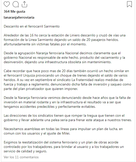 Y agregaron "Desde la Naranja Ferroviaria venimos denunciando desde hace años que la falta de inversión en material rodante y en la infraestructura el resultado va a ser que tengamos accidentes predecibles y perfectamente evitables. Exigimos la reestatización del sistema ferroviario y un plan de obras acorde, para brindar al usuario y a los trabajadores un servicio de calidad y seguro."