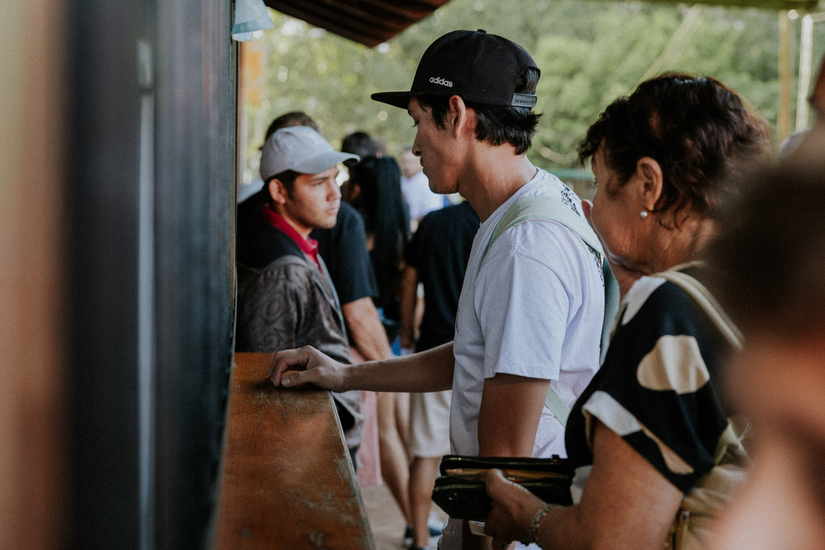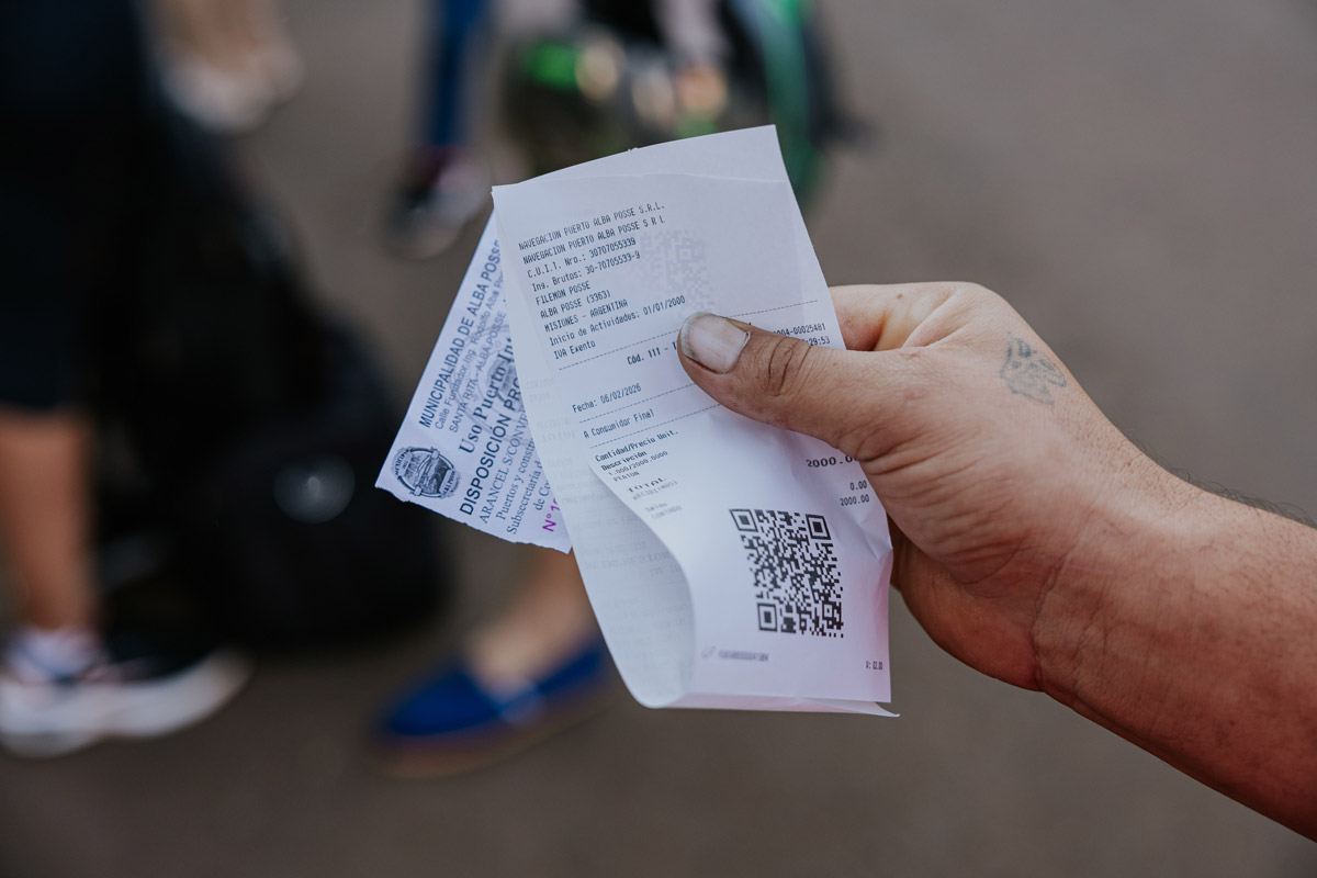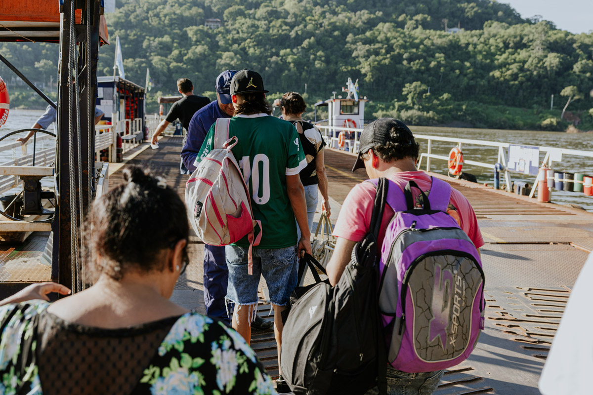 Cuando la lancha encalla en el puerto de Alba Posse, Dana junta sus cosas y se dirige hacia la casilla de Migraciones, donde ya hay más de un centenar de personas, entre pasajeros y acompañantes. La gran mayoría son varones jóvenes que, al igual que ella, cruzarán a Brasil para trabajar en las cosechas, principalmente de uva y de manzana.