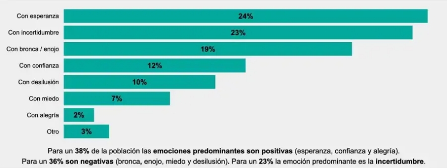 Los registros emocionales muestran contrastes notables: esperanza (24%) e incertidumbre (23%) dominan; la bronca/enojo es 19% y la confianza apenas 12%. Cuando se agrupan emociones positivas frente a negativas, el 38% cae en el bloque mayoritariamente positivo y el 36% en el negativo —una paridad que revela una sociedad en tensión emocional, con alta volatilidad en predisposición al cambio o a la movilización.