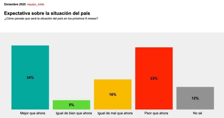 La encuesta de la consultora Equipo_Mide dibuja un escenario complejo a dos años de la asunción presidencial: hay una minoría optimista respecto al futuro inmediato (34% cree que "estará mejor") y una mayoría crítica sobre el rumbo del país (52% considera que la dirección es "equivocada").
