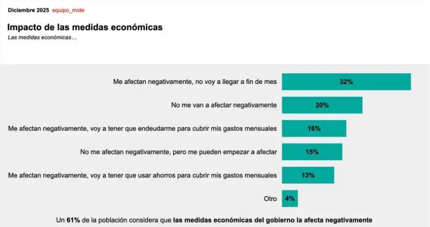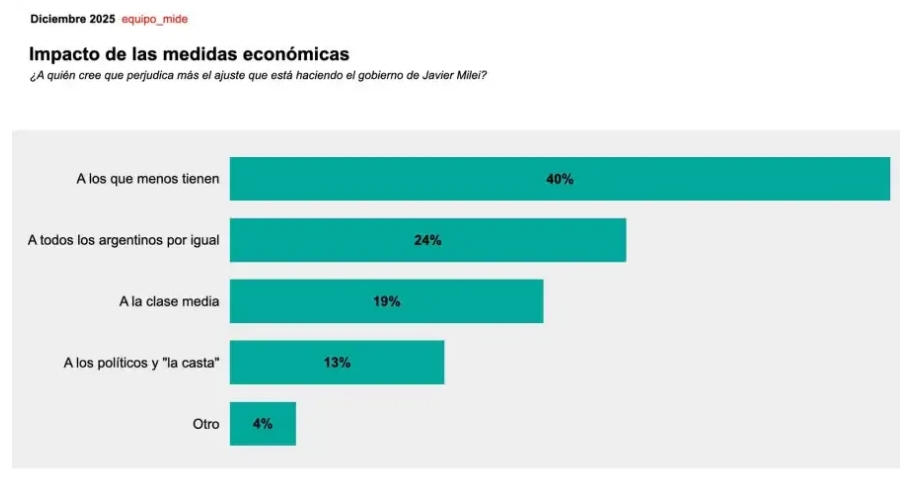 Un punto relevante del sondeo es la percepción sobre quiénes resultan más perjudicados por las políticas: 40% dice que afectan "a los que menos tienen", 24% "a todos por igual", 19% "a la clase media" y sólo 13% "a la casta política".