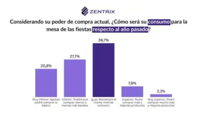 En ese sentido, el 48,5% de los encuestados afirma que su gasto para las fiestas resultará inferior o muy inferior al del año pasado, en línea con la pérdida de poder adquisitivo registrada durante 2025. La mesa de Navidad y de Año Nuevo aparecieron como indicadores concretos del ajuste cotidiano: menor volumen de consumo, sustitución de productos y una conducta defensiva que reemplaza al consumo expansivo tradicional para el fin de año.