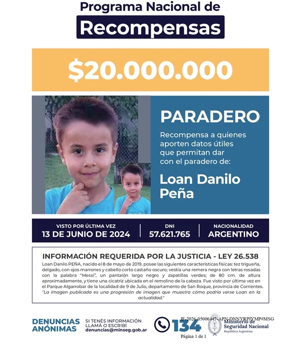 Luego de evaluar los pedidos de las querellas y ante la falta de avances decisivos en ambas investigaciones, el Ministerio de Seguridad Nacional confirmó el aumento de las recompensas para quienes aporten información certera sobre el paradero de Loan Danilo Peña y Lian Gael Flores.
