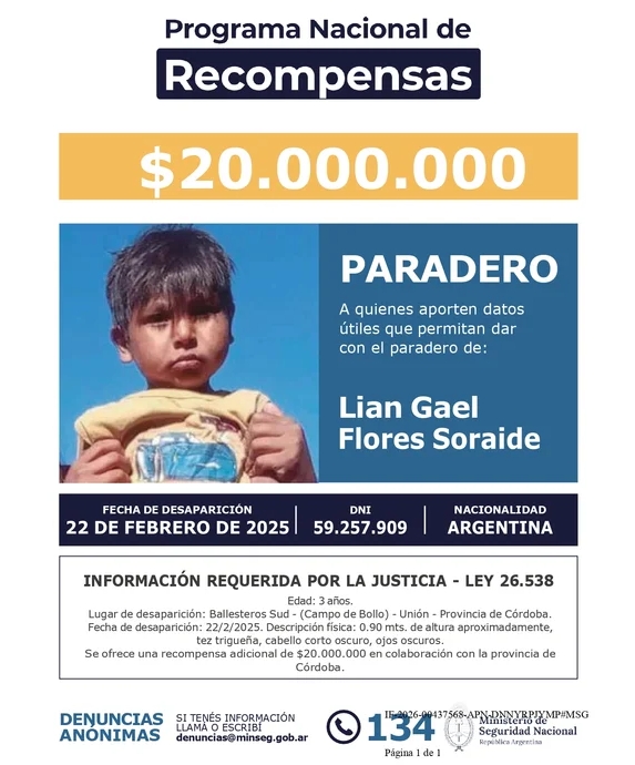 Una situación similar se dio con Lian Flores, el niño de tres años desaparecido el 22 de febrero de 2025 en Ballesteros Sud, provincia de Córdoba. En este expediente, la recompensa inicial había sido de $10 millones, aunque la provincia ya había dispuesto una cifra superior.