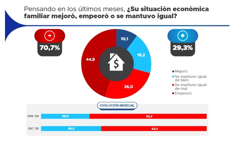 El dato más contundente del relevamiento aparece en la percepción sobre la economía familiar. Ante la pregunta sobre la evolución en los últimos meses, el 70,7% de los consultados aseguró que su situación empeoró, un salto significativo respecto de diciembre, cuando ese indicador era del 63,7%.