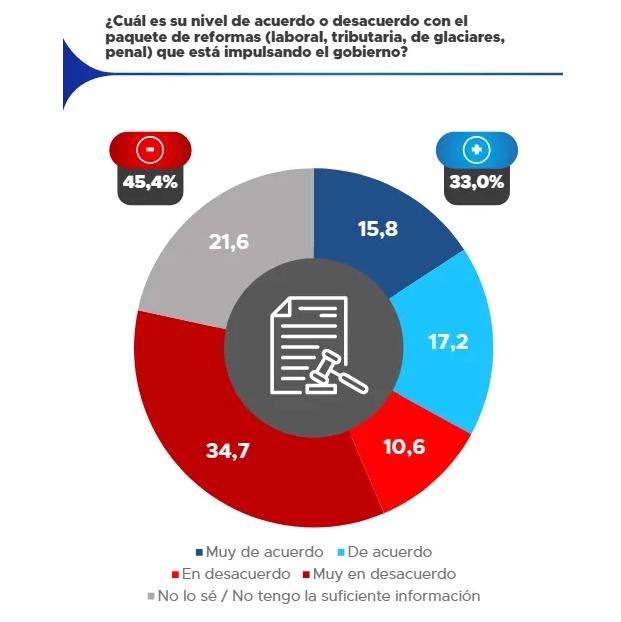 La evaluación de las reformas impulsadas por el Gobierno muestra un escenario dividido. El 45,4% manifestó estar en desacuerdo o muy en desacuerdo con el paquete que incluye cambios laborales, tributarios, penales y en la legislación ambiental, mientras que el 33% expresó su apoyo. Un 21,6% respondió que no tiene información suficiente o no sabe.