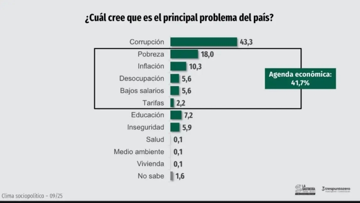 En la medición de septiembre, la corrupción alcanzó el 43,3%, duplicando el registro de inicios de gestión y superando al bloque económico (41,7%), que suma pobreza (18%), inflación (10,3%), desocupación (5,6%), salarios bajos (5,6%) y tarifas (2,2%).
