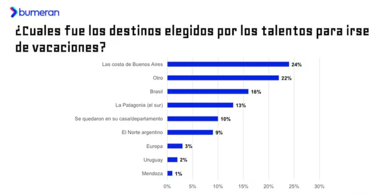 El 24% viajó a la Costa Atlántica bonaerense, mientras que otros destinos concentraron el 22%, con el Caribe como principal elección. Brasil fue elegido por el 16% y la Patagonia por el 13%, según los datos de Bumeran.