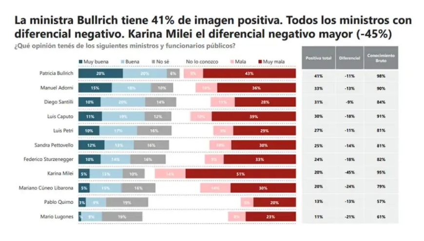 La encuesta también midió la opinión favorable de varias figuras nacionales. Javier Milei vuelve a quedar en el primer lugar, seguido muy de cerca por Patricia Bullrich y la vicepresidenta Victoria Villarruel. Los tres sostienen un núcleo duro de adhesiones que se mantiene relativamente estable frente al desgaste político general.