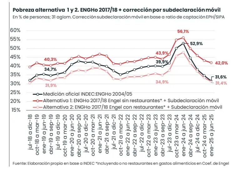 Si se corrige la medición ajustando la canasta básica total a los ponderados 2017/2018 y además se adapta con la mejor captación de ingresos que tiene el Indec desde mitad de 2024, los pobreza representaría el 42%, es decir, 11 puntos más de los que dice el organismo estadístico.
