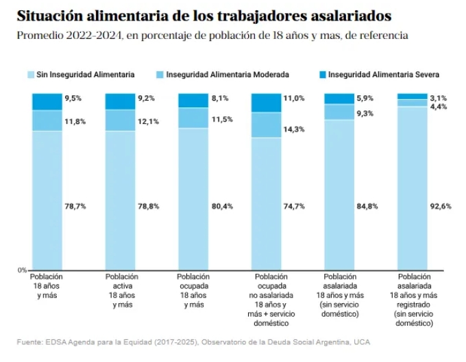 El estudio, que abarca el promedio de los últimos tres años, también mostró que la situación se agrava entre los informales y los cuentapropistas, donde el índice trepa al 25%, evidenciando que tener empleo no garantiza el acceso a una alimentación suficiente o de calidad.
