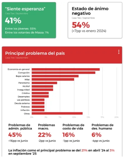El informe también revela que el 17% considera que la economía es el principal problema del país, seguido por la corrupción y los bajos salarios. El cuarto problema más mencionado, según la encuesta, es el propio presidente Milei.