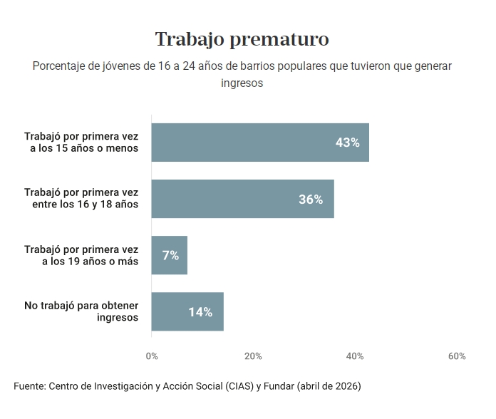 La investigación, anticipada en exclusiva para LA NACION, logró además identificar las razones de esa fuga o expulsión del sistema educativo. La conclusión es que los "jóvenes están solos" y la escuela como faro que promete progreso se desvanece en los barrios populares. La mayoría de los chicos que dejan el colegio, empiezan a trabajar a los 14 años o menos para sumar ingresos al hogar y muchos se ocupan de cuidar a sus hermanitos. En general, crecen en hogares "rotos", "conflictivos" o donde las madres, único sostén familiar, están exhaustas, dicen que no dan más, que solas no pueden.