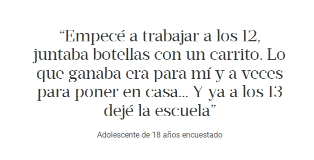 Mario, que hoy tiene 18, empezó a cartonear a los 12. Salía con sus cinco hermanos menores, como hacía su padre. En su barrio, Santa María, en San Miguel, juntaba botellas. Con eso conseguía el equivalente a unos 10 mil pesos de hoy: 5 mil eran para su mamá y 5 mil para él. Después, cuenta, la calle lo cambió. A los 13, se empezó a drogar. Consumía antes de entrar al colegio. Sentía que así el día pasaba más rápido. También lo ponía violento. Una vez lo apuñalaron a la salida. Sus padres nunca se enteraron. Cuando él lastimó "mucho" a un compañero, lo echaron. Comenzó a ir a un colegio nocturno, pero no le encontraba "sentido". Al poco tiempo, abandonó. Y, según reconoce, siguió con "mala junta".