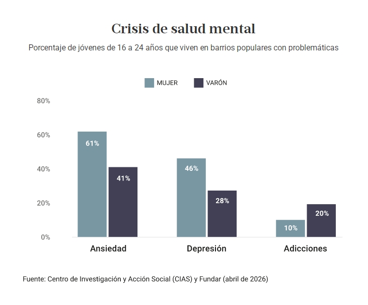 El análisis de ese quiebre de las trayectorias escolares, marcado por una desigualdad estructural, pone luz en problemáticas que necesitan una intervención urgente: la naturalización del consumo problemático de sustancias y una crisis de salud mental sin precedentes. La mitad de los jóvenes afirman haber sufrido ansiedad y el 37%, depresión.