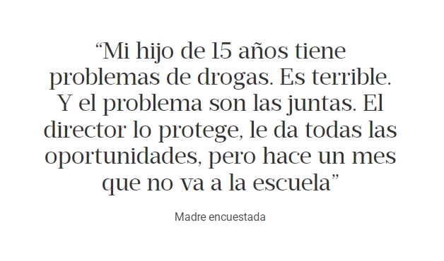 "Los chicos están atravesados por la violencia, problemas de salud mental, carencias económicas y, en ese contexto, la escuela no llega a garantizar su continuidad, está desbordada porque la vida afuera está desbordada. La escuela no puede cambiar lo económico, la dinámica de trabajo de los chicos y el ingreso de las familias, pero sí debería tener más herramientas y presupuesto para contenerlos", suma María Migliore, referente de Fundar, la otra ONG que intervino en la elaboración del estudio, realizado en base a 600 encuestas presenciales a jóvenes.