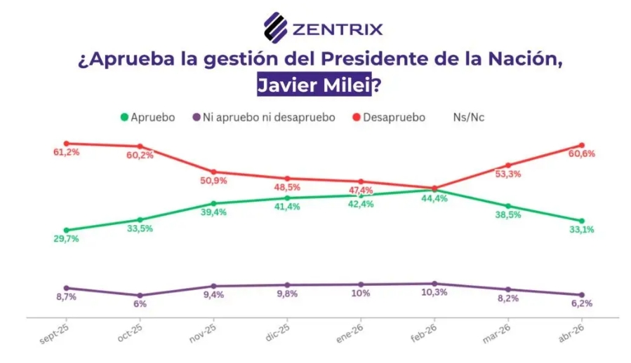 Todo esto se refleja en una marcada caída de la aprobación de la gestión de Milei. En abril, esta cayó al 33,1%, su registro más bajo desde octubre del año pasado y muy lejos del máximo de 44,4% alcanzado en febrero de 2026.