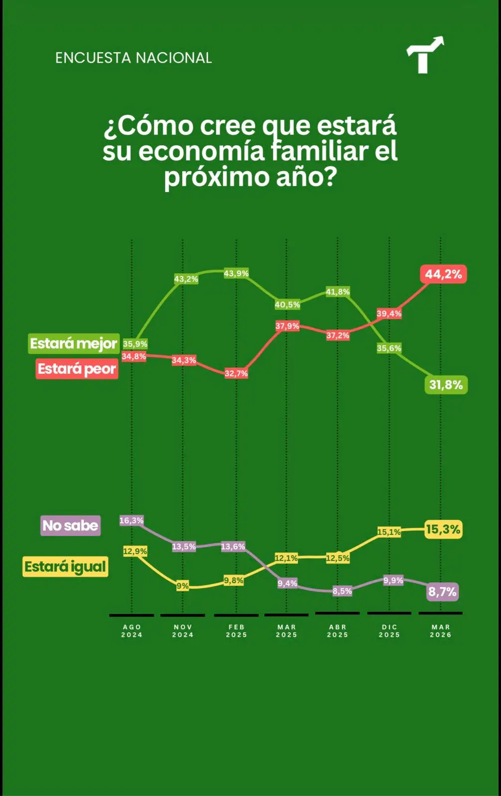 El deterioro de la imagen del Presidente coincide con el de las expectativas. Por primera vez en los últimos meses se cruzaron las curvas y una mayoría de los consultados cree que su economía familiar estará peor el año que viene, según el estudio de Tendencias. Eso respondió el 44,2%, frente a un 31,8% que cree que estará mejor, un 15,3% que dice estará igual y un 8,7% que "no sabe".
