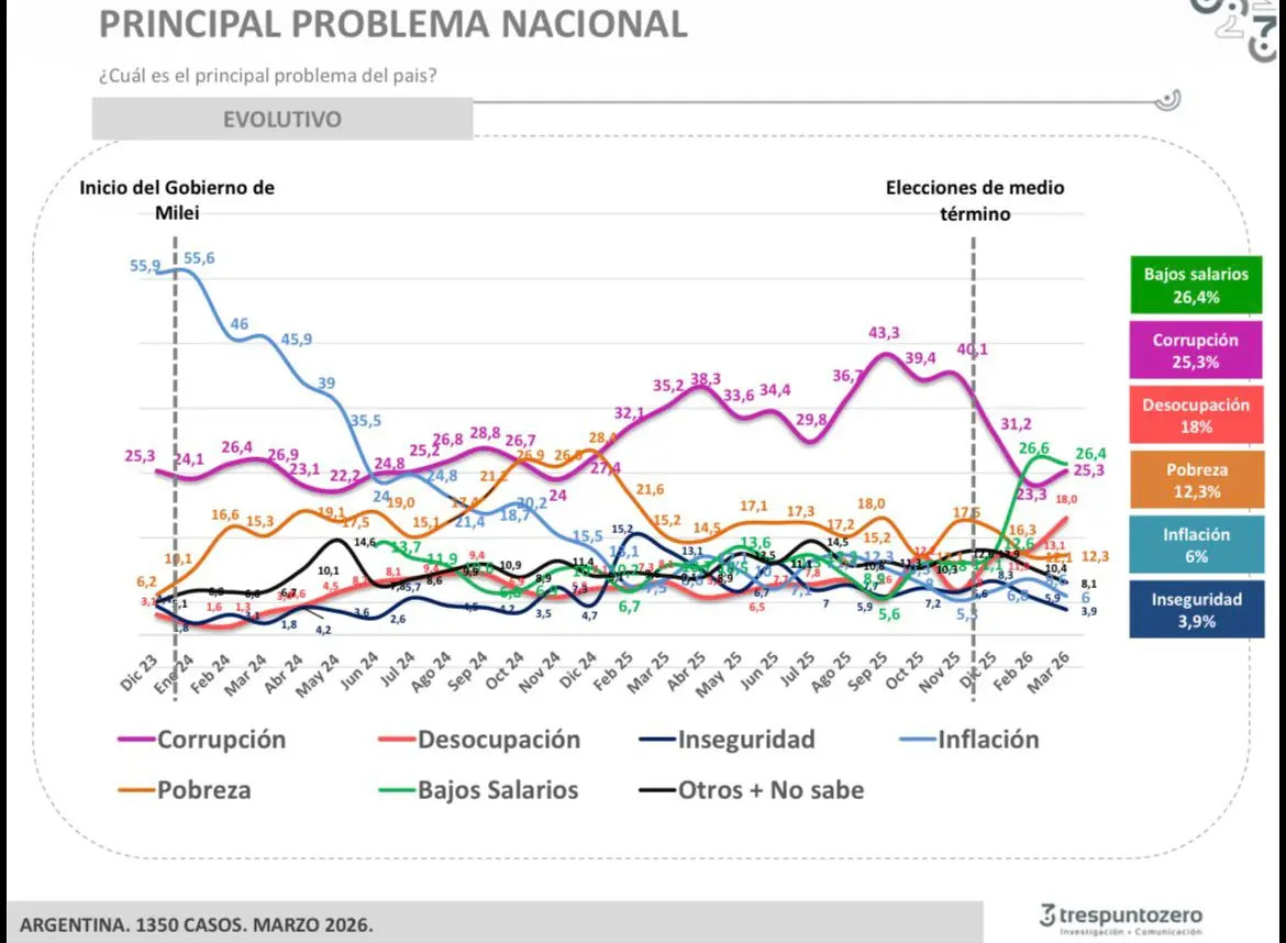 La caída de las expectativas se combina con otro novedoso de la encuesta de Trespuntozero. Con el 26,4%, los bajos salarios encabezan por primera vez la tabla del principal problema del país. Con porcentajes altos también aparecen desocupación (18%) y pobreza (12,3%).