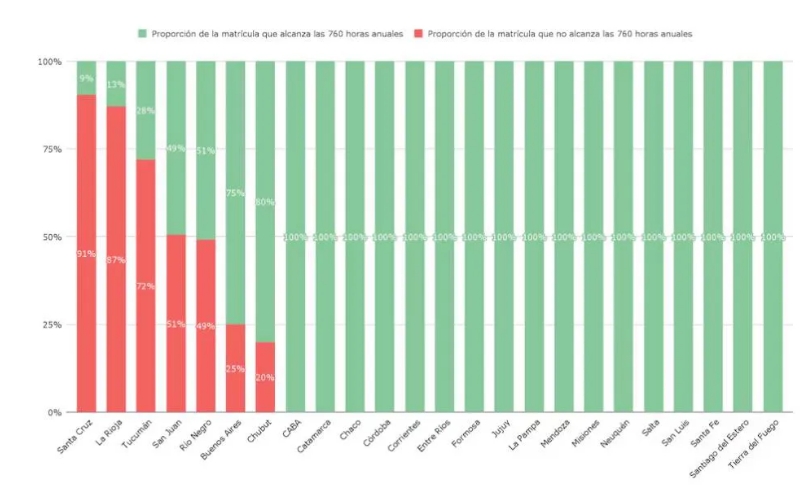 Entre las provincias más comprometidas se encuentran Santa Cruz: 91% de los alumnos por debajo del piso; La Rioja: 87%; Tucumán: 72%; San Juan: 51%; Río Negro: 49%; Buenos Aires: 25%; y Chubut: 20%.