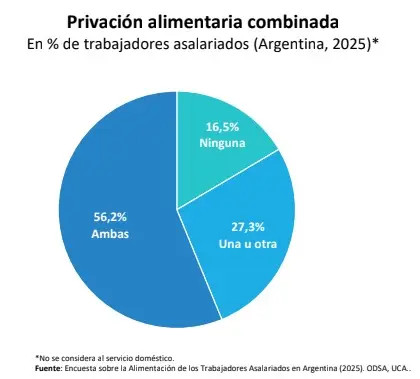 El estudio advirtió que la inseguridad alimentaria entre trabajadores formales se volvió un fenómeno extendido, con recortes tanto en la cantidad como en la calidad de los alimentos consumidos durante la jornada laboral. Según la investigación, apenas el 16,5% de los asalariados está libre de privaciones alimentarias. En contraste, el 83,5% experimenta algún tipo de vulnerabilidad, lo que refleja el deterioro del poder adquisitivo en un contexto de inflación persistente.