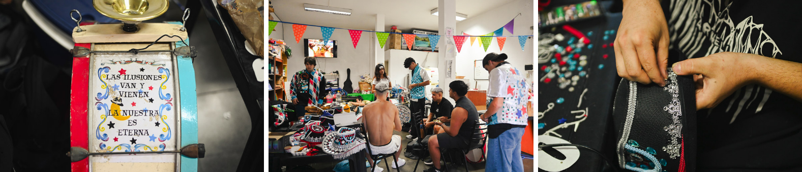 La familia es clave en este mundo de bailes alborotados y golpes de bombo. Ezequiel Cuomo es hincha de San Lorenzo (por eso prefiero hablar con él) y tiene diecinueve años. Toca el bombo, pero además es guitarrista de una banda que mezcla el heavy metal con el thrash. Su madre, sus dos tías y su abuela también fueron murgueras. La abuela le enseñó a coser su propio traje. Ezequiel también arregla sombreros funyi para otros murgueros. "Para entender a un murguero tenés que ser amigo o familiar de un amigo —dice sentado bajo un jacarandá—. Si tuviste un mal día y no encontrás una salida, venís acá y estás en familia. Eso no quiere decir que no giren cosas, pero la mayoría de las veces son cosas lindas".
