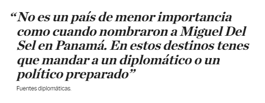 Sin embargo, en la diplomacia cayó mal esa posibilidad porque dudan de la capacidad de Iglesias para llevar a adelante una tarea diplomática tan relevante. "No es un país de menor importancia como cuando nombraron a Miguel Del Sel en Panamá. En estos destinos tenes que mandar a un diplomático o un político preparado", afirma un diplomático.
