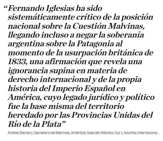 Dachary continúa y remarca que "el problema es aún más grave. Fernando Iglesias ha sido sistemáticamente crítico de la posición nacional sobre la Cuestión Malvinas, llegando incluso a negar la soberanía argentina sobre la Patagonia al momento de la usurpación británica de 1833, una afirmación que revela una ignorancia supina en materia de derecho internacional y de la propia historia del Imperio Español en América, cuyo legado jurídico y político fue la base misma del territorio heredado por las Provincias Unidas del Río de la Plata".