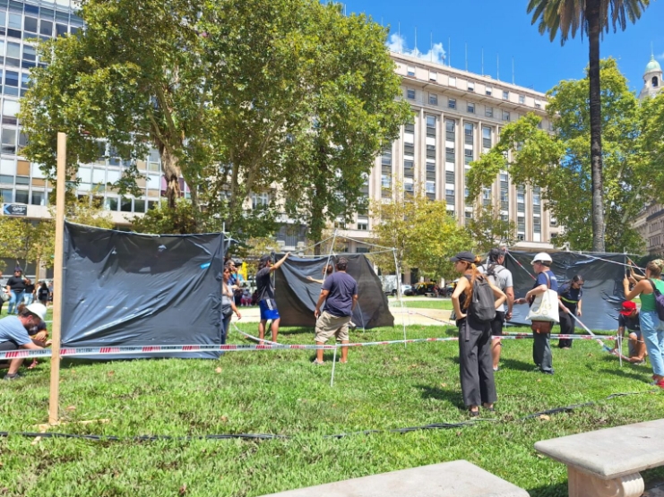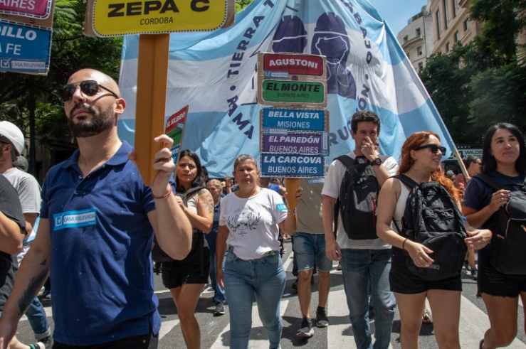 Ante esto, ayer al mediodía trabajadores, miembros de la UTEP, de ATE, organizaciones sociales y políticas, cooperativas de trabajo y asociaciones civiles que fueron parte de las políticas de integración sociourbanas, realizaron una conferencia de prensa frente al edificio y luego marcharon hasta Plaza de Mayo donde se realizó una toma de tierras simbólica montando típicas casillas.