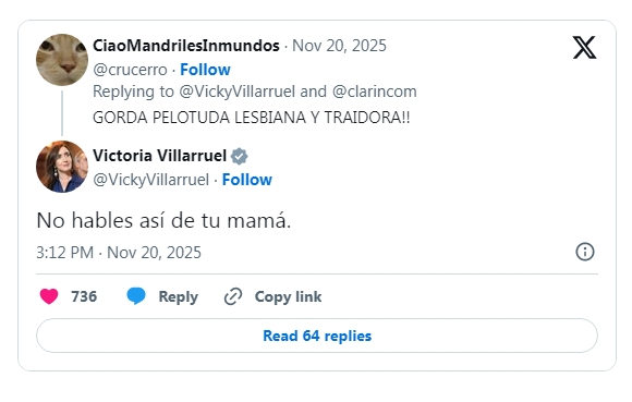 "Mi sueldo está congelado hace 2 años. Ese recurso no les sirve. Tampoco recibo fondos reservados", dijo Villarruel, en referencia a los fondos de la SIDE que depende de Santiago Caputo y que siempre se asociaron al financiamiento de las milicias digitales de Milei.